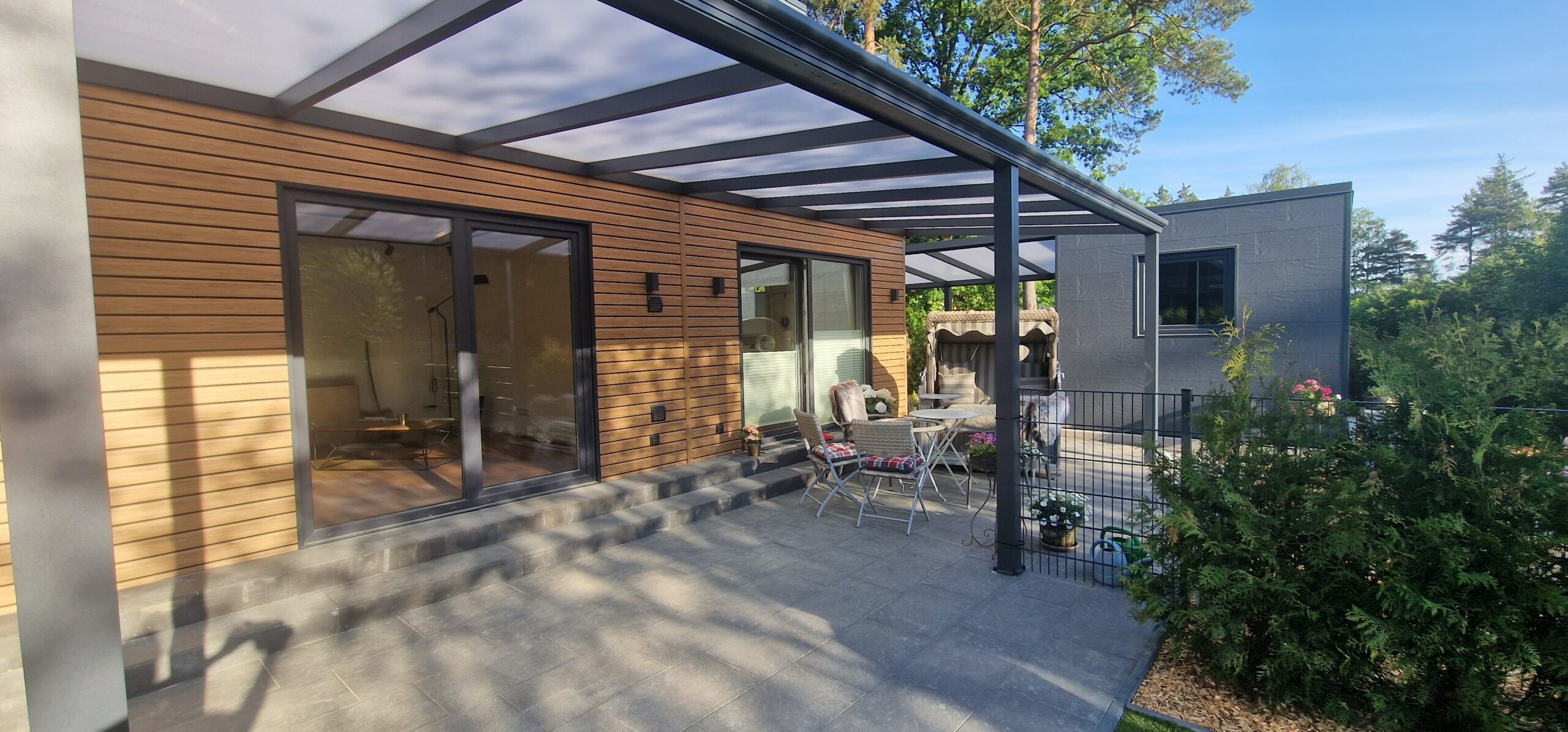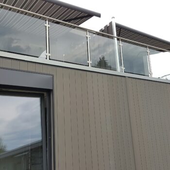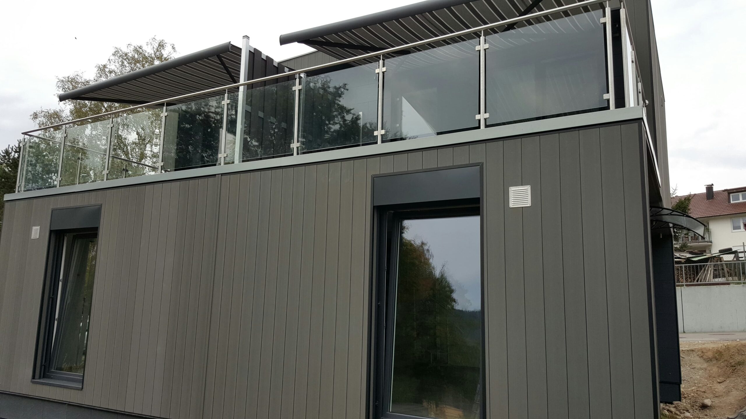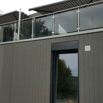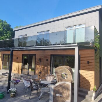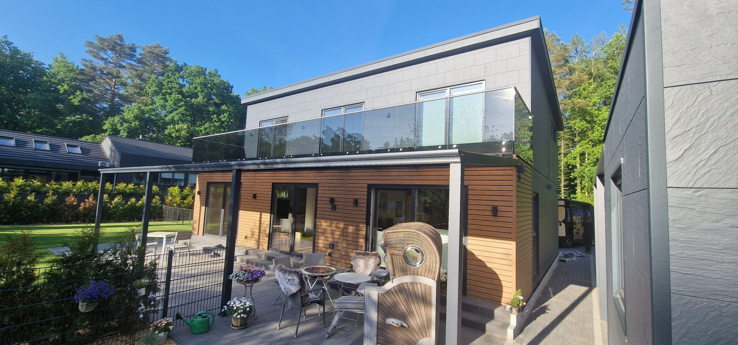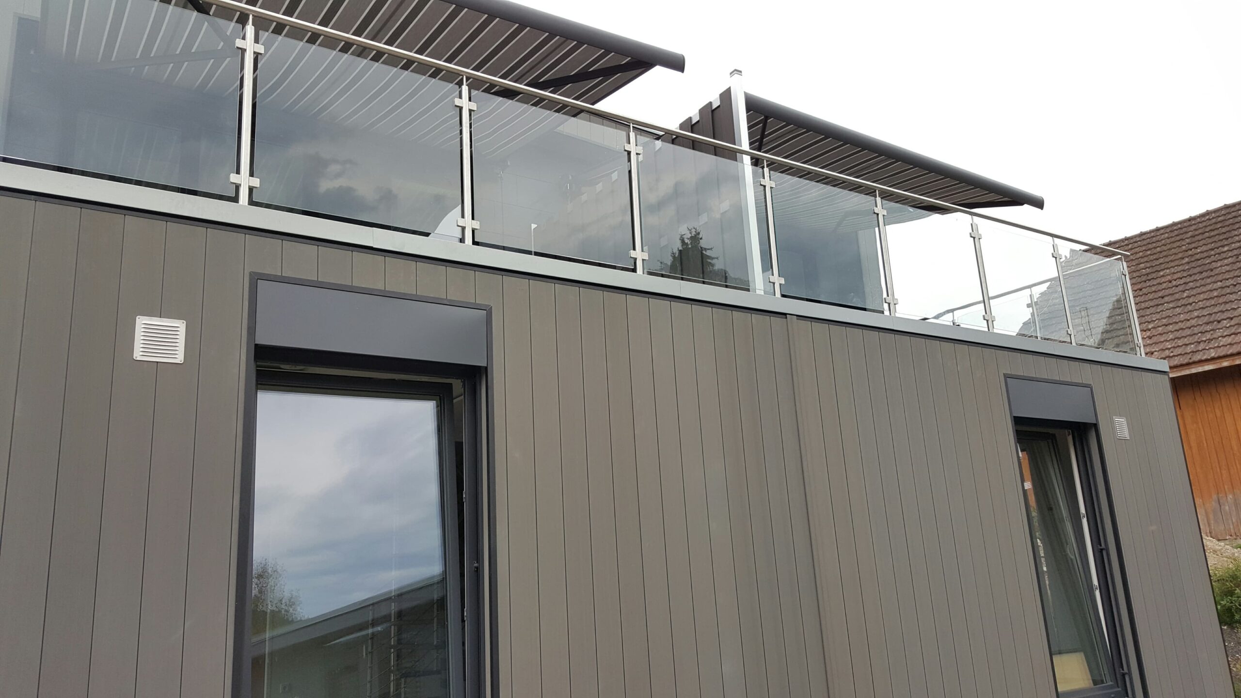Es besticht durch eine elegante Fassadenverkleidung aus einem Holz-Kunststoff Mix und eine große Dachterrasse mit Glasgeländer, die über eine elegante Treppe erreicht werden kann. Bei einer Wandstärke von 26cm und Dreifach-Verglasung erhält dieses Mobilheim den Energieeffizienzausweis (EnEV).