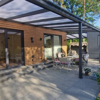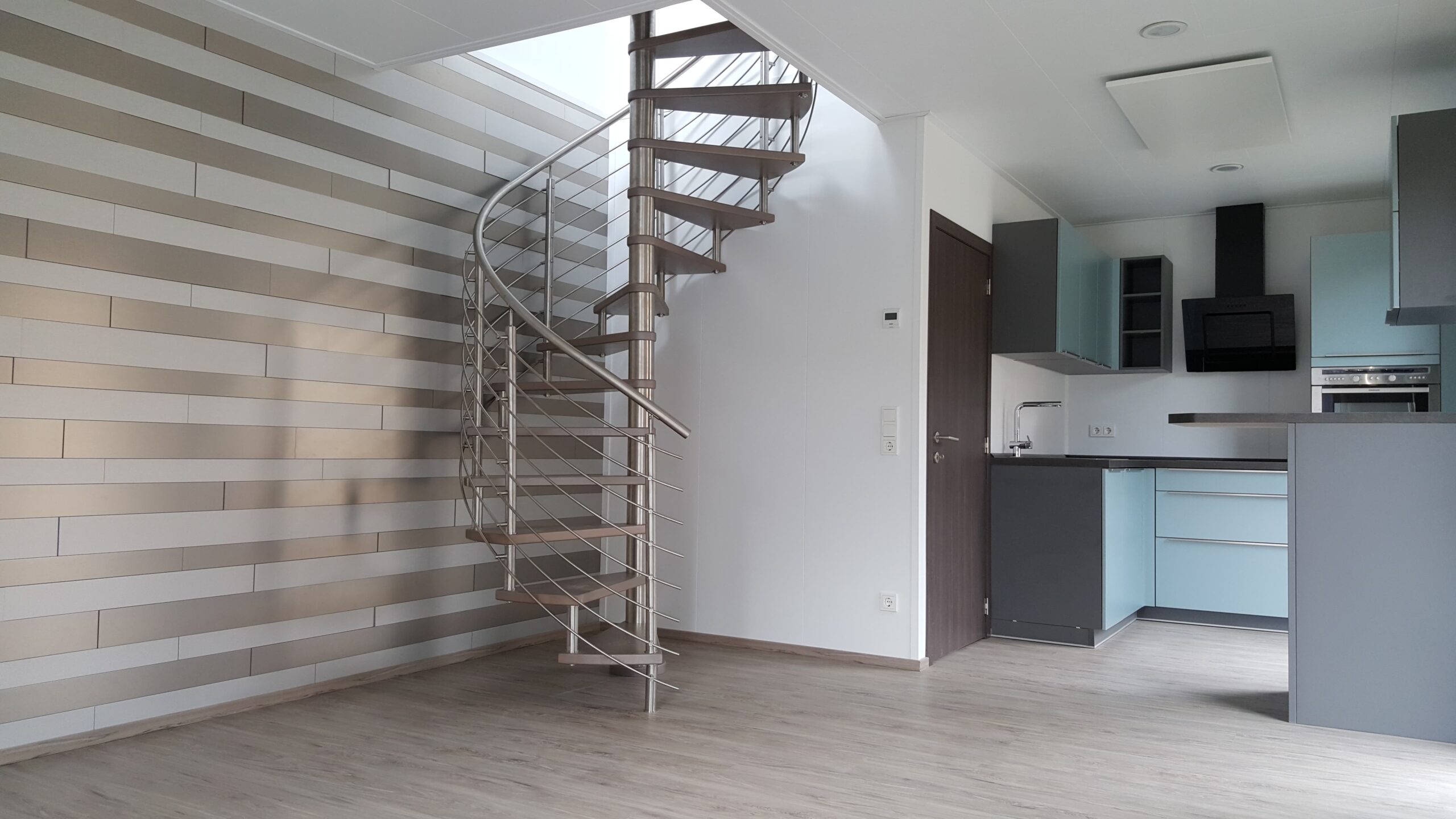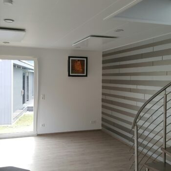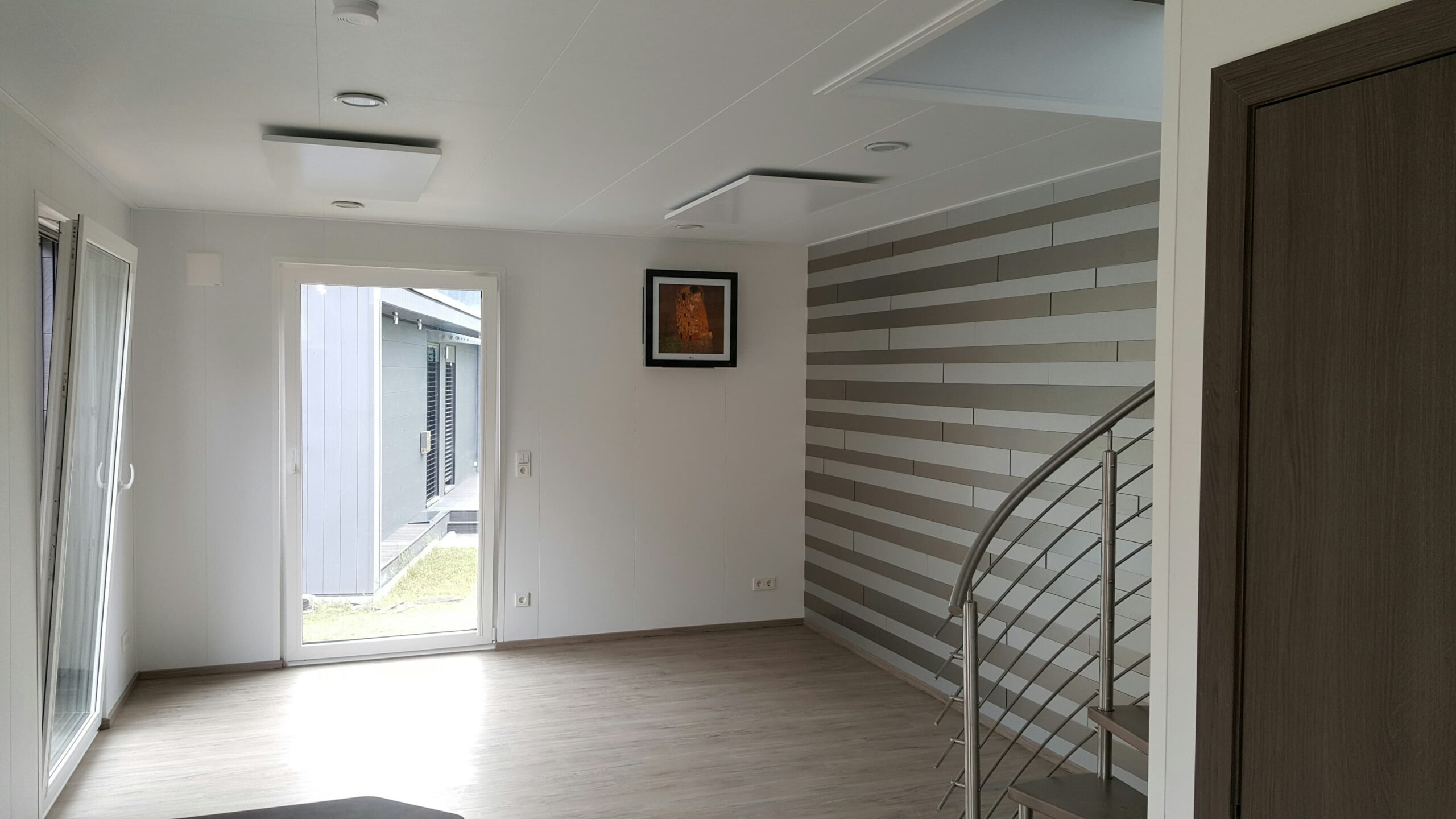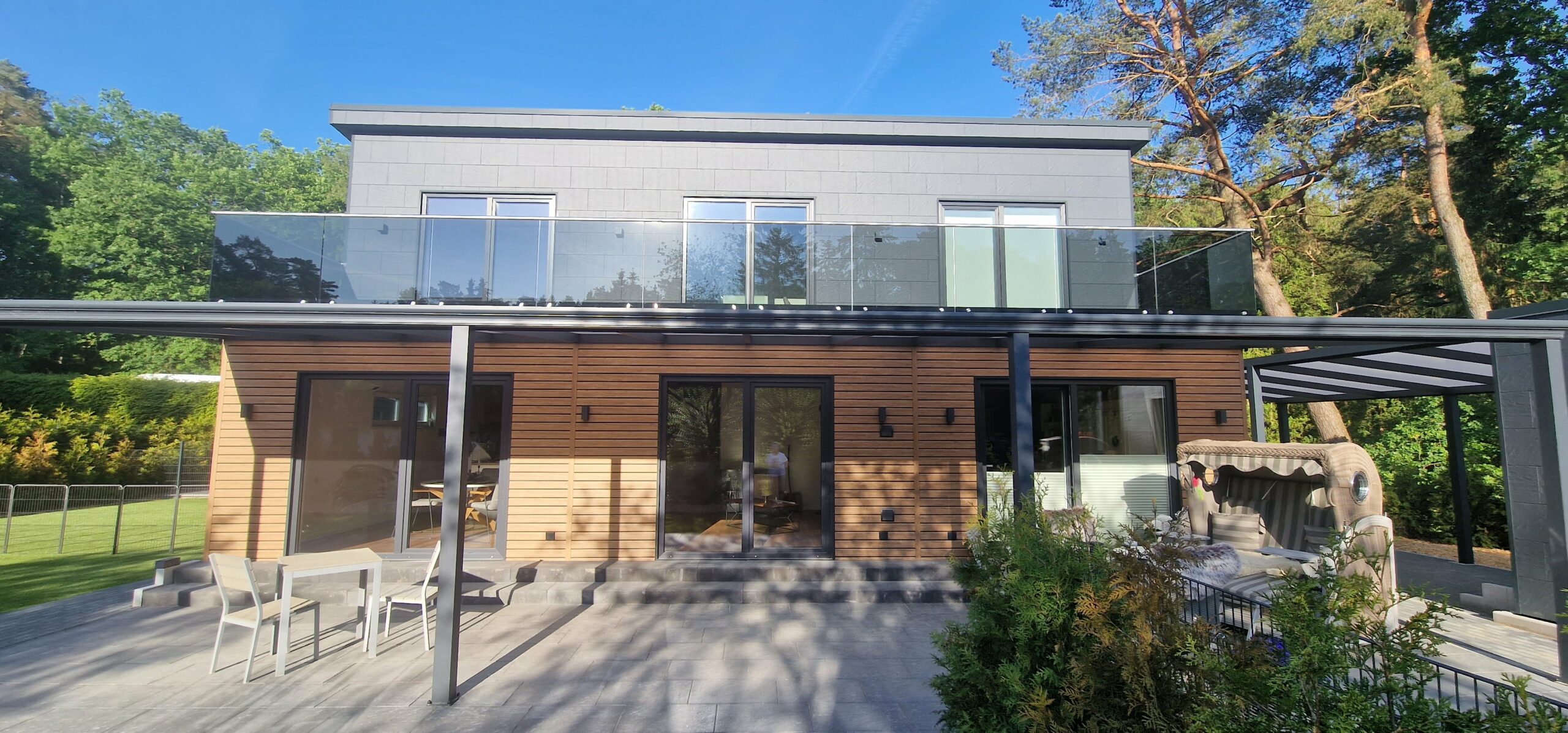 Es besticht durch eine elegante Fassadenverkleidung aus einem Holz-Kunststoff Mix und eine große Dachterrasse mit Glasgeländer, die über eine elegante Treppe erreicht werden kann. Bei einer Wandstärke von 26cm und Dreifach-Verglasung erhält dieses Mobilheim den Energieeffizienzausweis (EnEV).