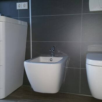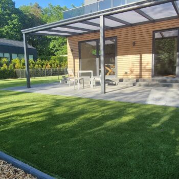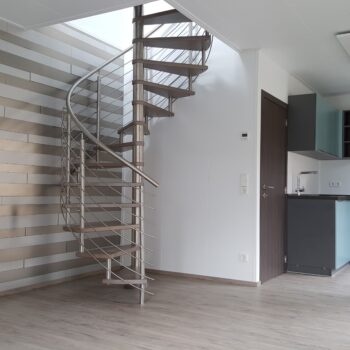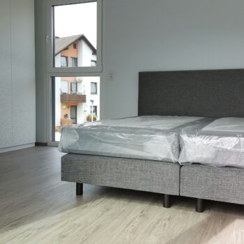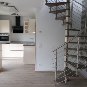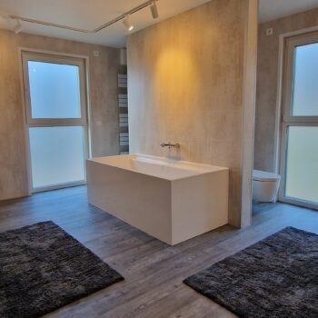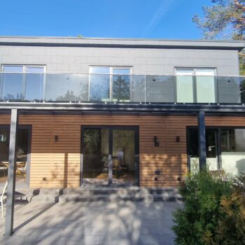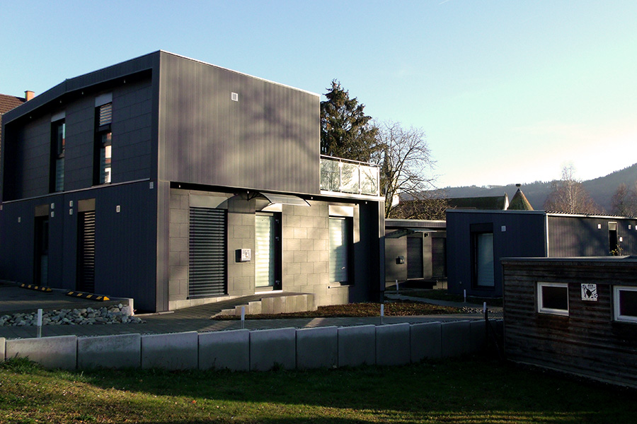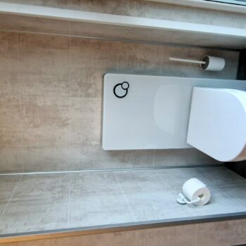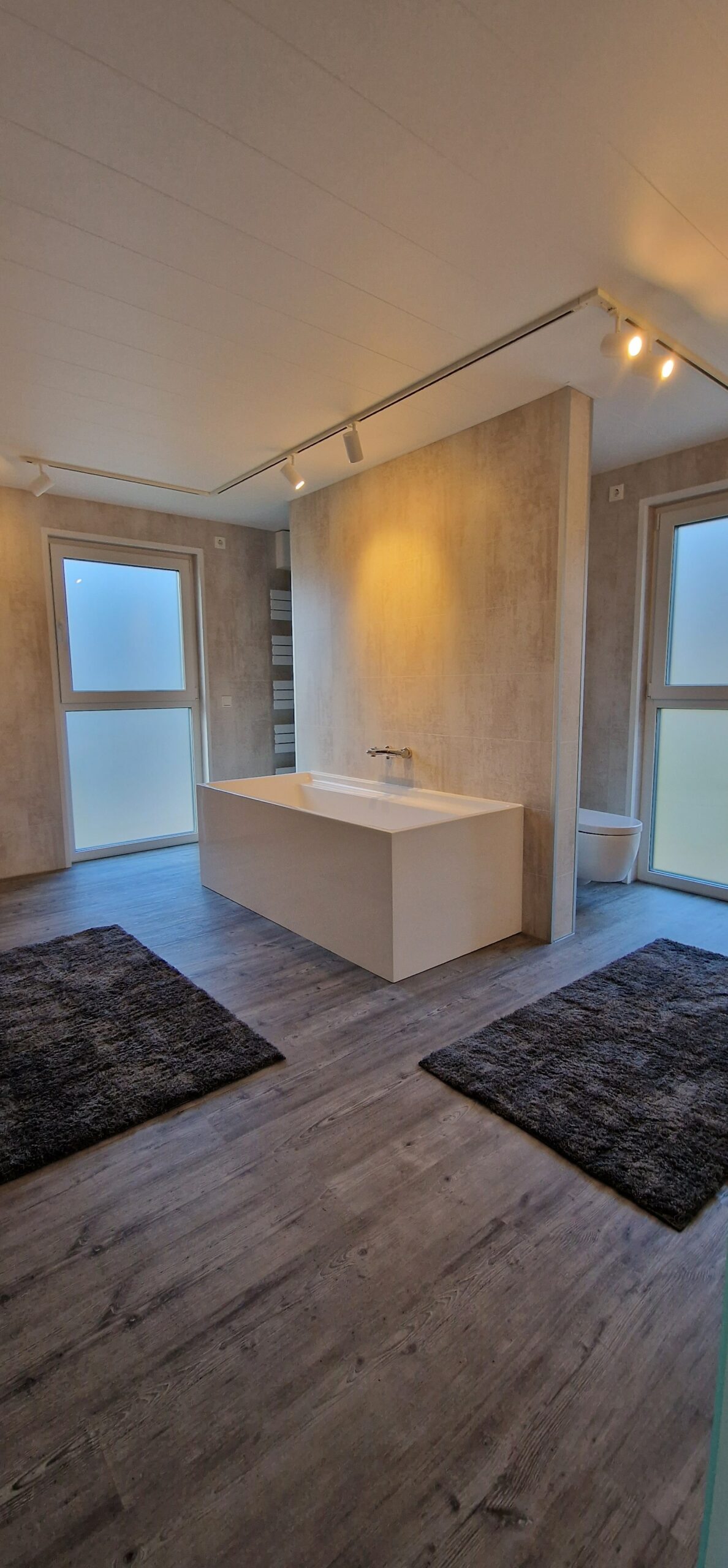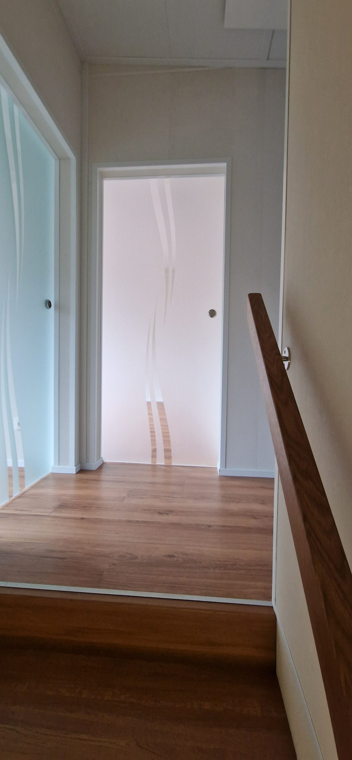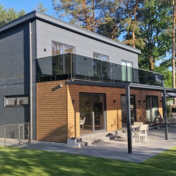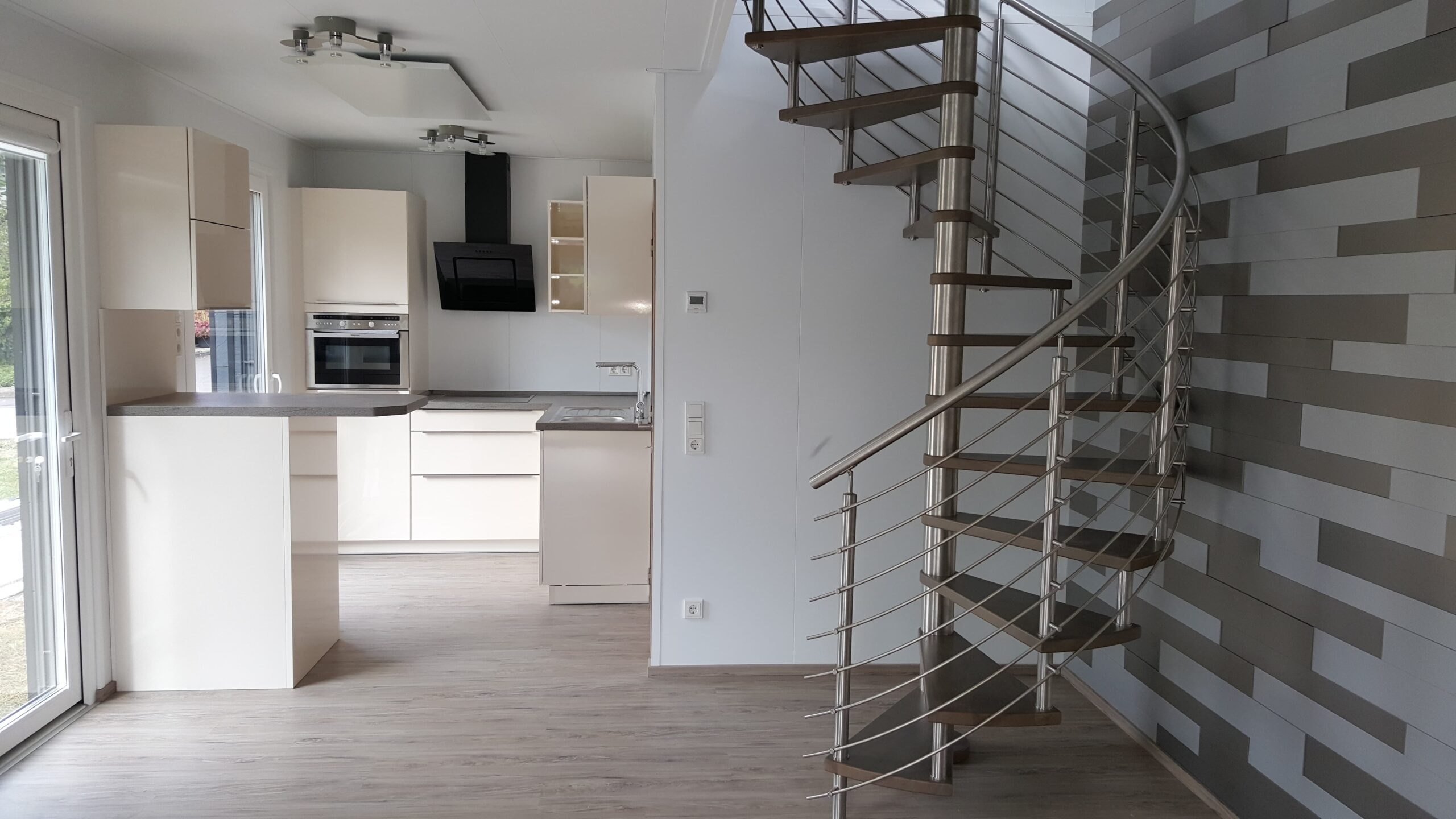 Es besticht durch eine elegante Fassadenverkleidung aus einem Holz-Kunststoff Mix und eine große Dachterrasse mit Glasgeländer, die über eine elegante Treppe erreicht werden kann. Bei einer Wandstärke von 26cm und Dreifach-Verglasung erhält dieses Mobilheim den Energieeffizienzausweis (EnEV).